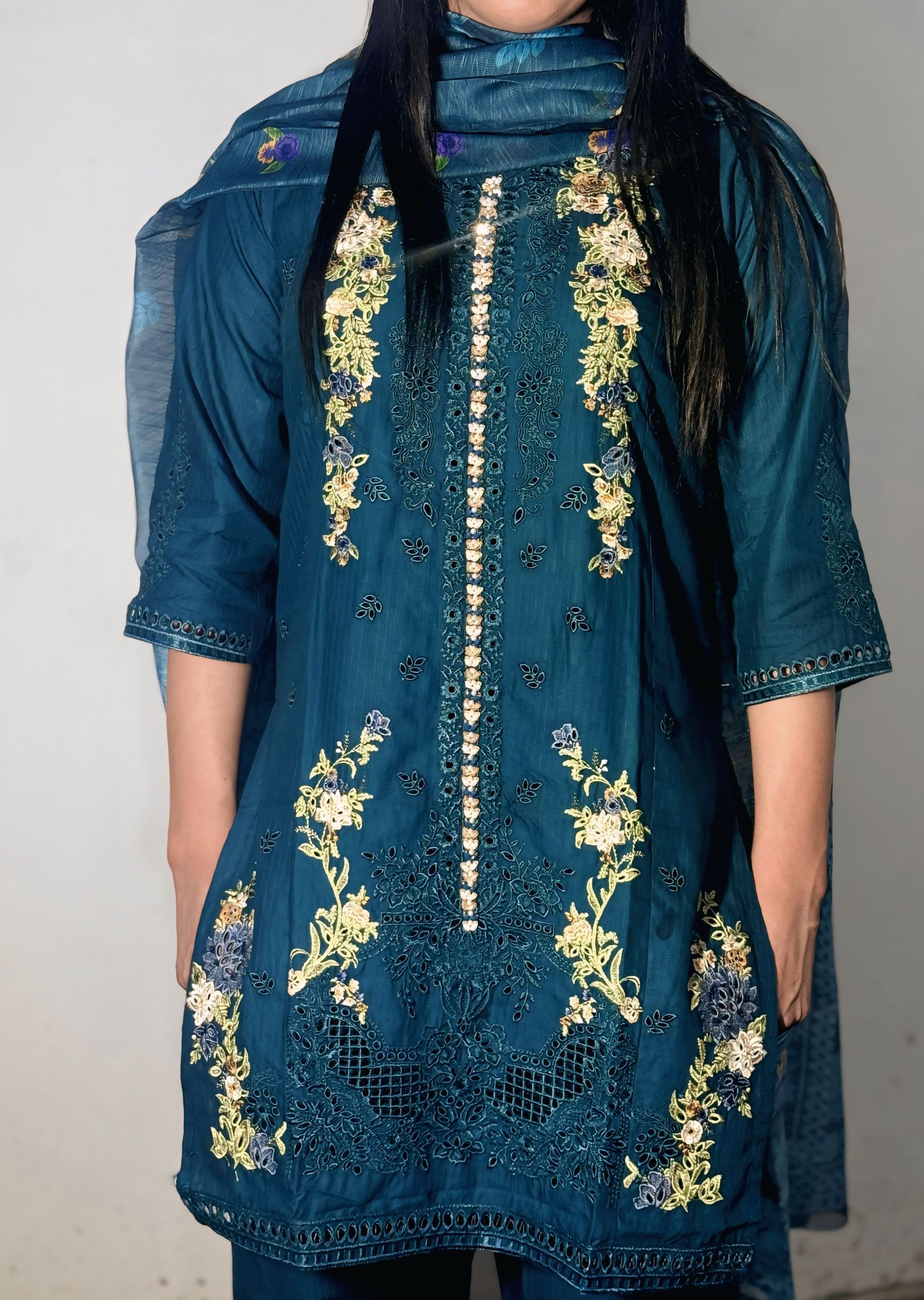 Step into timeless elegance with this beautifully handcrafted teal blue long slit kurti. Made from premium quality cotton, this outfit features intricate hand embroidery and delicate mirror work. The floral detailing along the neckline and borders adds a touch of sophistication, while the soft printed dupatta and comfortable lining trouser complete the look.